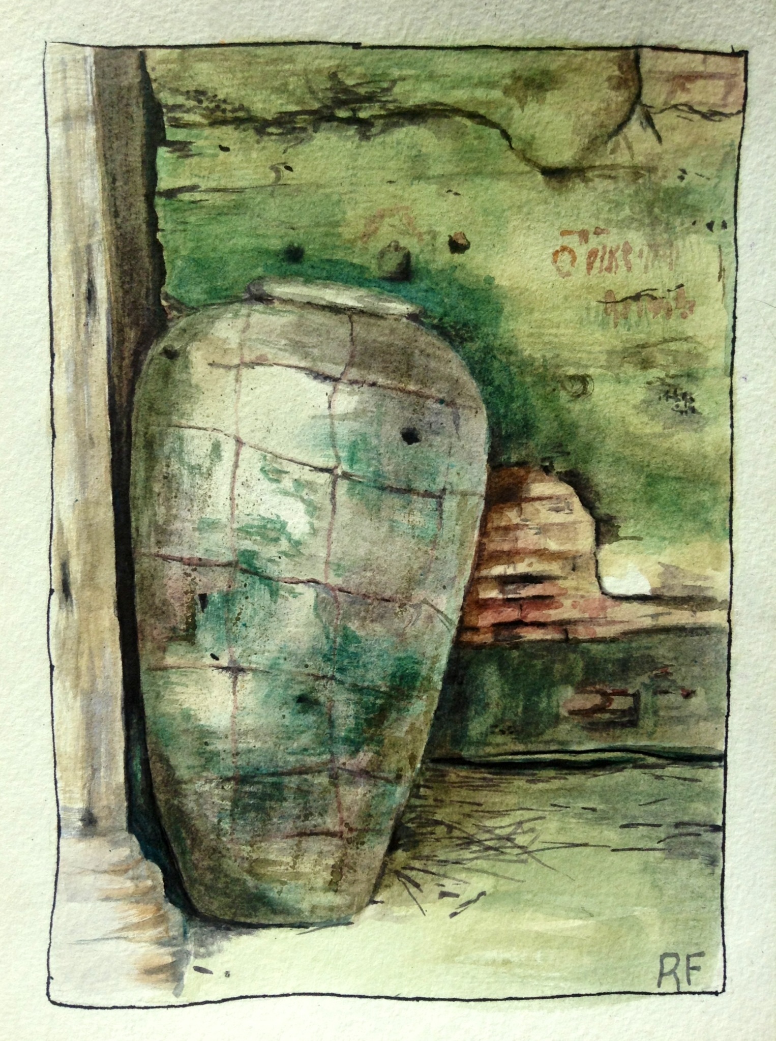I’ll be posting several paintings from my visit to Mahisa, India. The whole village was an artist’s dream, with interest looking people, ancient tools, and ornately carved facades. This grain canister was nearly as tall as me. It was sitting on a porch where it had seemingly been resting for 50 years.