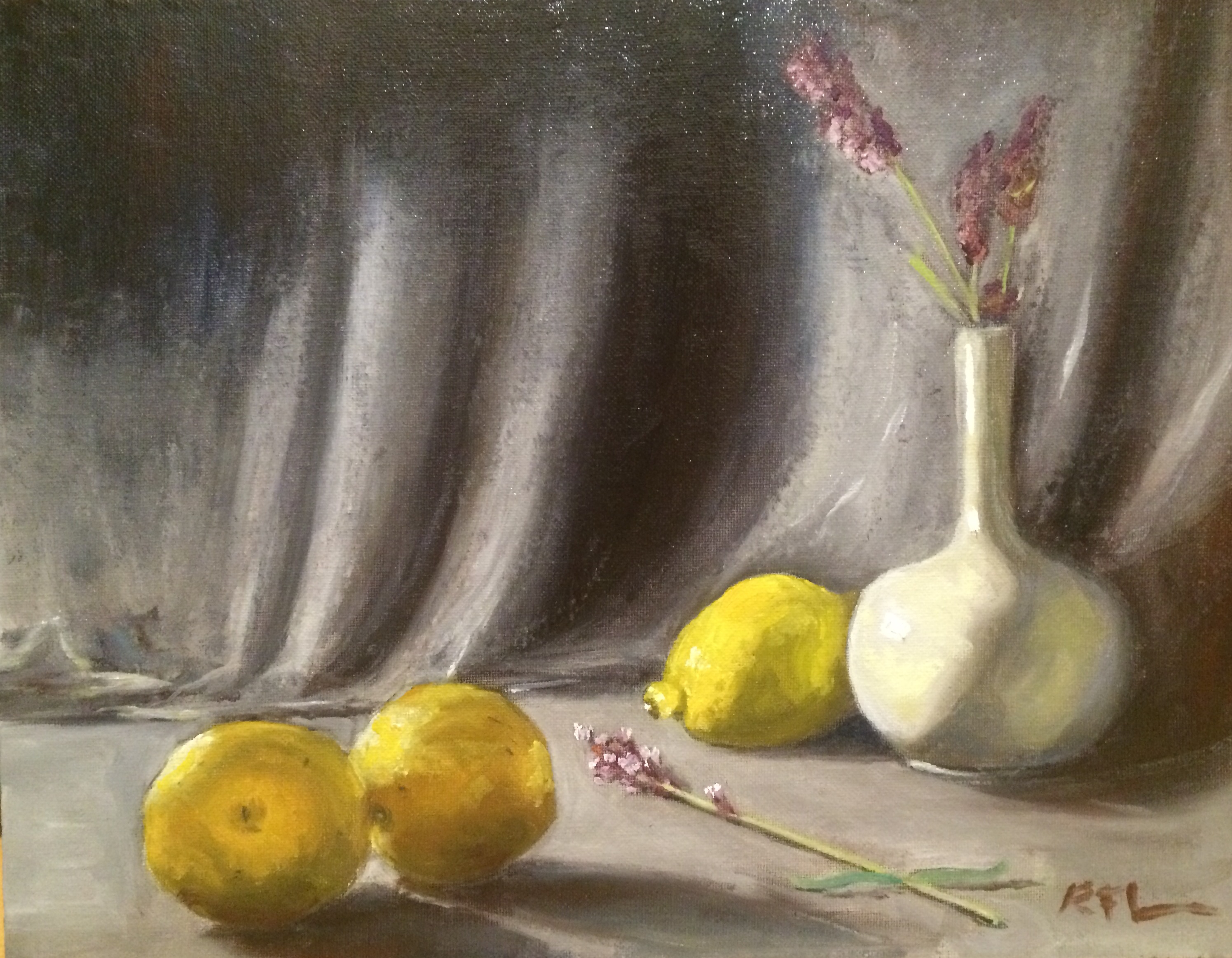 I painted this little still life using my very fist… custom… handmade… shadow box! Sure, it’s cardboard with an old nightgown stapled/superglued around the inside, but I think it did the trick just fine 🙂