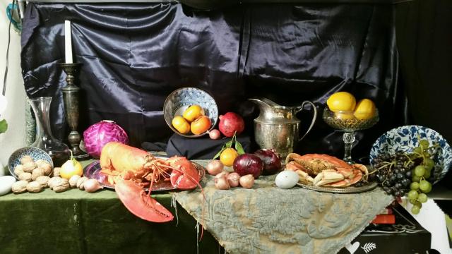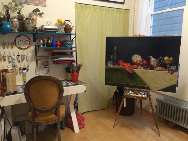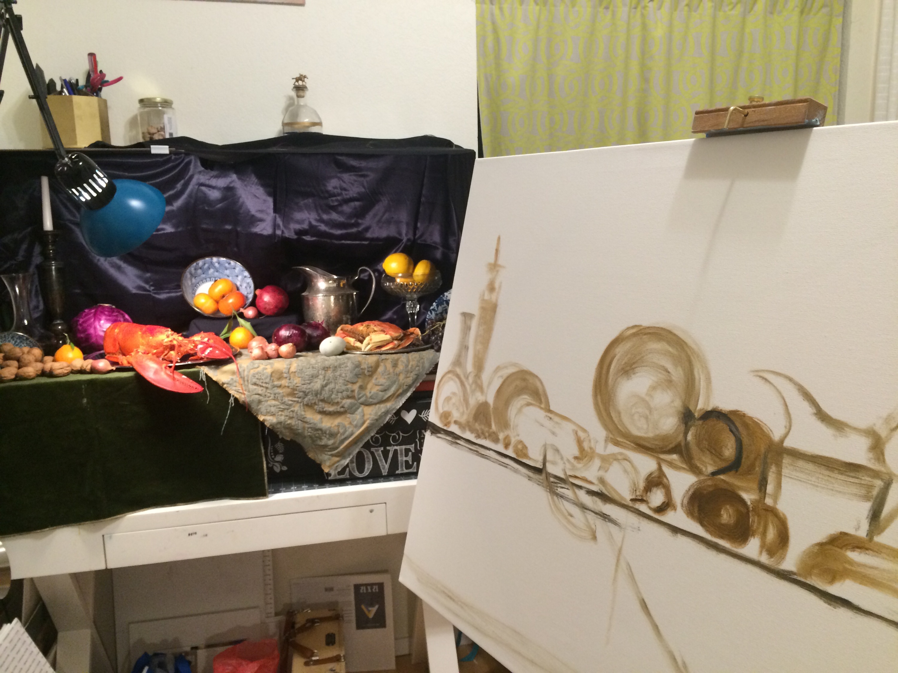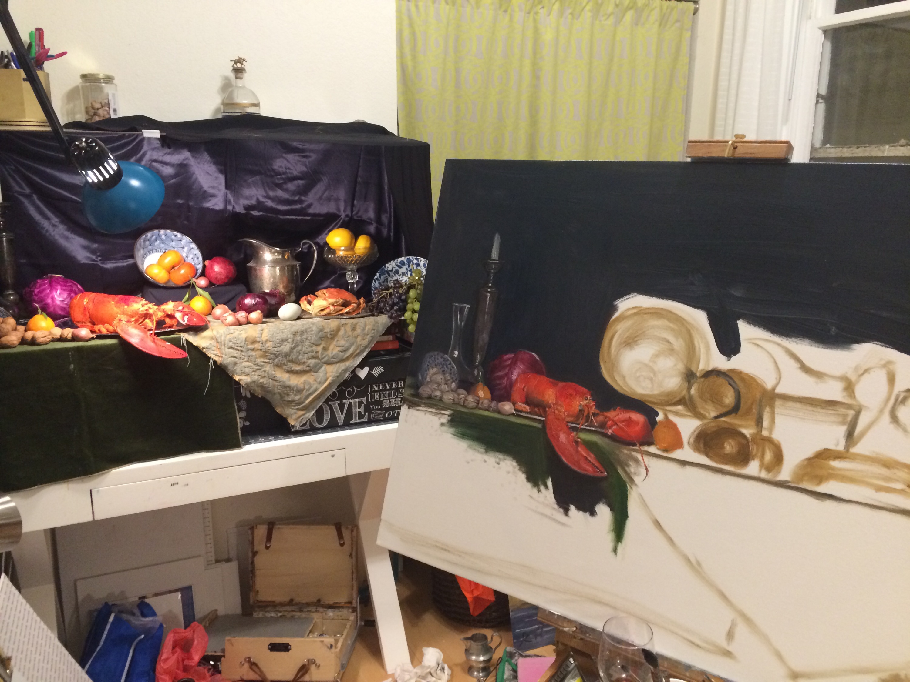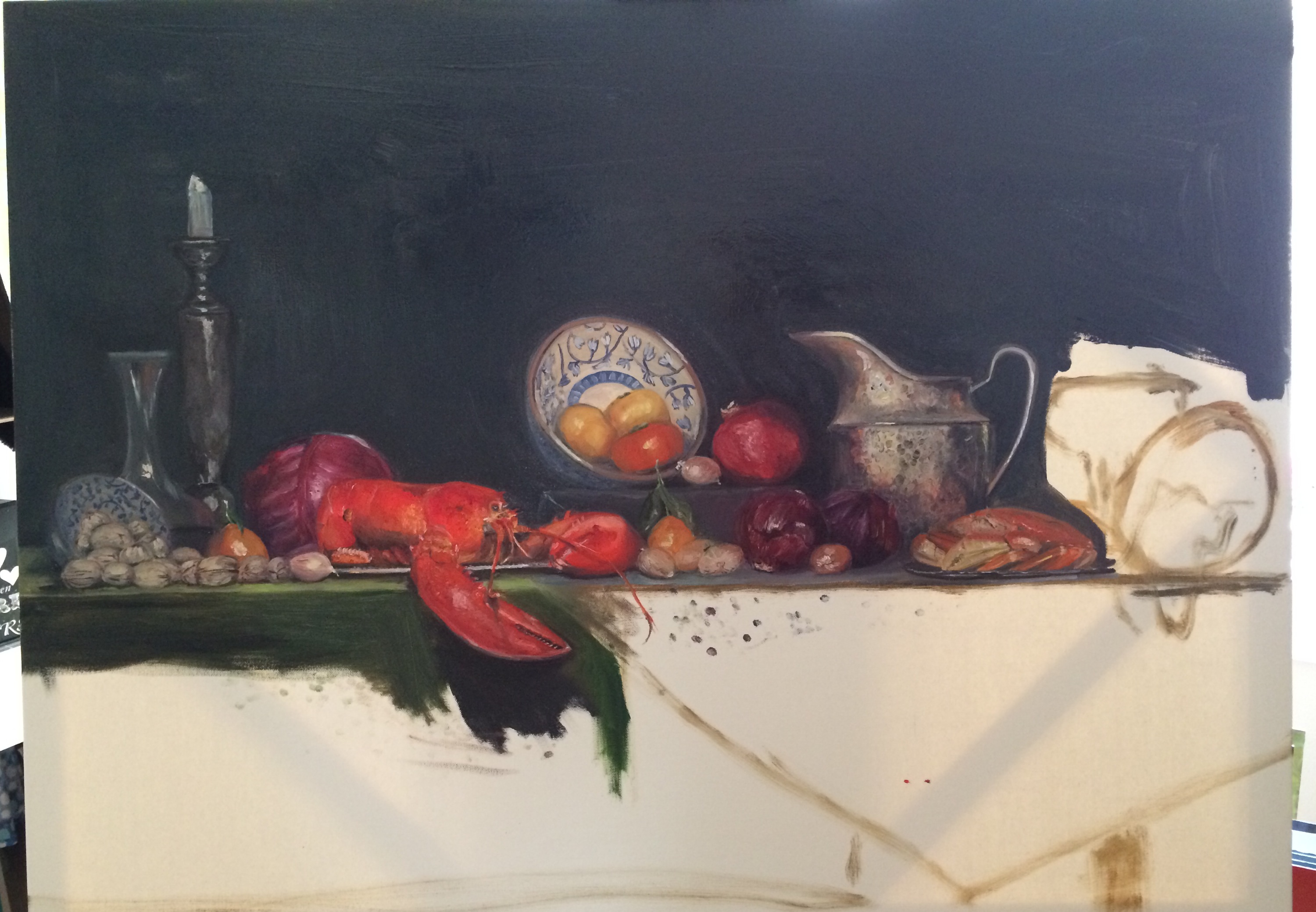 We’ve been talking about how cool it would be to paint an “epic” still life for quite some time. One with wine, fruits, nuts, table cloths, silver platters….everything….even a lobster and crab. A classic banquet still life. Well, this weekend, with Harrison’s help, I finally went for it!