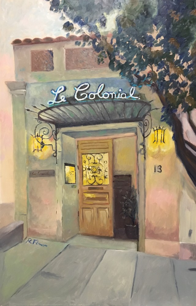 Le Colonial I spent the weekend finishing up a commission. My client asked for a large oil of the restaurant, Le Colonial. Sunday was a beautiful day in the city, so I painted on the roof! Share this: Click to share on X (Opens in new window) X Click to share on Facebook (Opens in new window) Facebook Like Loading...