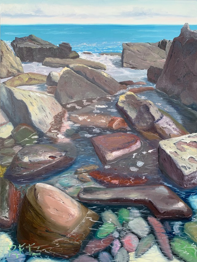 I thought it would be fun to paint several “versions” of water all in one piece; the blue flat distant ocean, the purple and white disturbance as the water hits the rocks initially, the layer of foam and bubbles as the water gets close, and the crystal clear water that covers the rocks at my feet. How wonderful 🙂