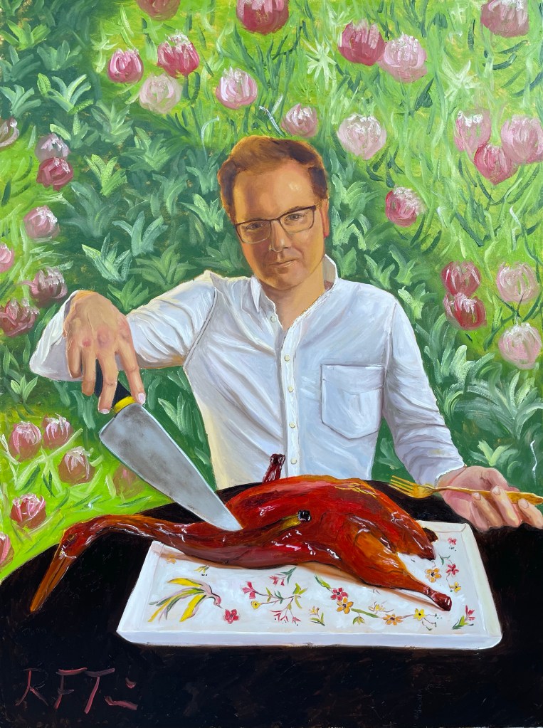 The annual portrait festival continues :). Harrison is posing with a sharp knife and a Peking duck in front of a decorative peony field. A grand time was had by all!